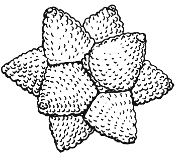 6-й ряд – * 4 столбика без накида, 5 столбиков без накида провязать в одну петлю основания, 4 столбика без накида, 3 столбика без накида провязать вместе * , повторить от * до * 5 раз. Ряд закончить соединительным столбиком;