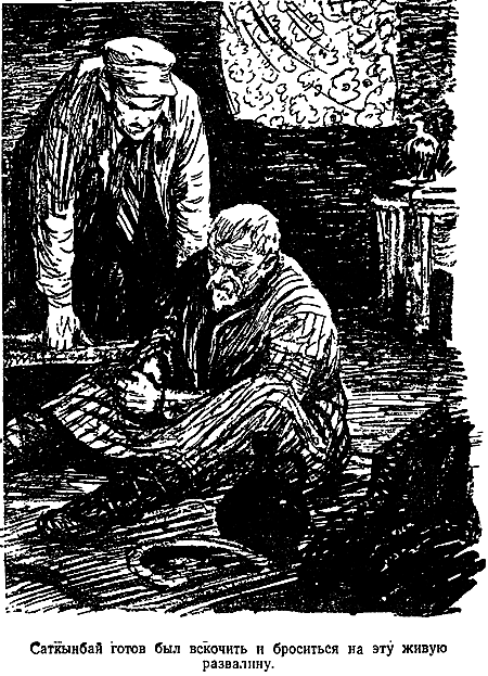 Саткынбай не ошибся: он стоял в знакомом до мелочей дворике Ширмата. Несколько деревьев совсем высохло, дувал сильно накренился, хауз засыпан, но арычок попрежнему пересекает двор. При входе в дом Саткынбай столкнулся со старой женщиной. Она отошла в сторонку и дала ему дорогу. В комнате Саткынбай увидел щуплого, обрюзглого старика в потрепанном халате, сидящего на полу. Казалось, появление гостя ничуть не удивило старика. Он посмотрел на него неподвижным, безучастным взглядом и остался сидеть, не шелохнувшись.