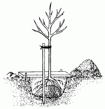 После того как ямы для деревьев подготовлены, в месте посадки забивают кол и ставят возле него саженец так, чтобы корневая шейка находилась на расстоянии около 30 см от почвы, привязывают саженец к опоре и набрасывают на корни специально приготовленную питательную смесь (способ ее приготовления смотрите выше) таким образом, чтобы получился небольшой холмик.