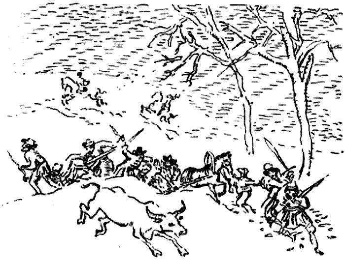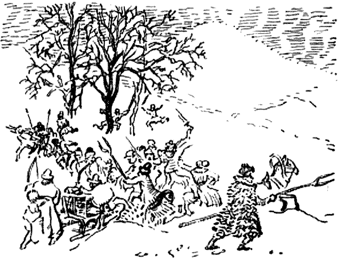 Как только показались разбойники, передние сани остановились. Ждер торопливо поскакал к своим людям, отдавая приказы. В это время они успели протянуть ему саблю, лук и колчан со стрелами Между тем воины, сидевшие на санях, спрыгнули в снег навстречу нападавшим, и оружие их сверкнуло в лучах солнца. Волы, сгрудившись, остановились на мгновенье, затем, подстегнутые громкими криками разбойников, напавших сзади, кинулись с ревом вперед. Люди Ждера и сам он, подхваченные потоком испуганных животных, с трудом пробились на простор. Служителям, находившимся у задних саней, было легче. Но им пришлось отбиваться от основных сил казаков.