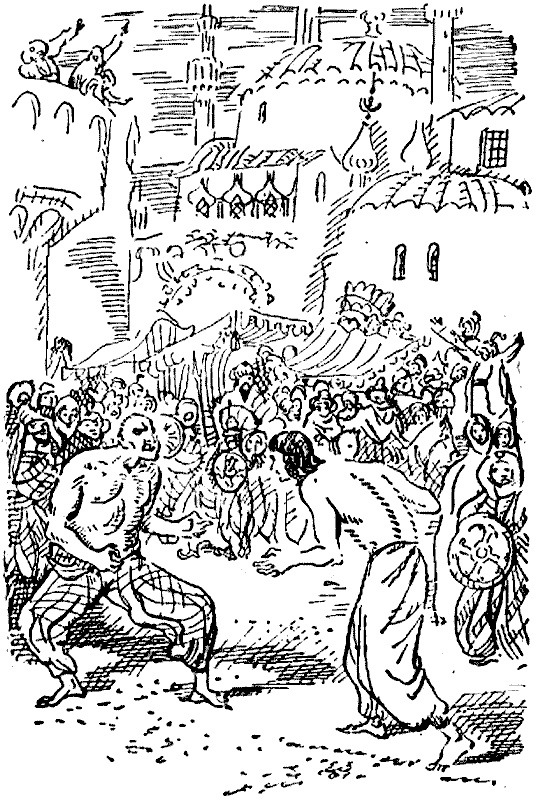— Сиятельный Храна-бек ждет противника борца Узуна! Разрешается выйти любому желающему, правоверному или гяуру, ибо сегодня радостный день — праздник в честь его величества Мехмета, императора императоров. Храна-бек обещает двадцать пять пиастров каждому из первых трех храбрецов, которые отважатся помериться силами с Узуном.
