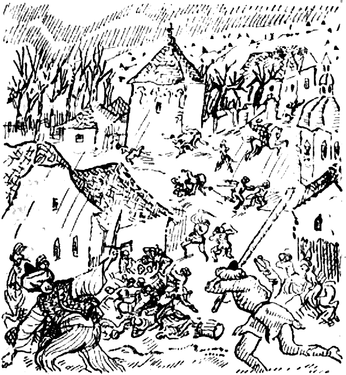 И когда затрубил этот рог, вслед за ним протрубили в рог начальники отрядов, и тотчас тысячеголосый крик рэзешей во всех концах села с такой силой ворвался в дождливую тьму, что синьор Гвидо почувствовал, как у него волосы на голове становятся дыбом. Он крепко сжал рукоятку шпаги, и его охватило возбуждение боя. Ошеломленные измаильтяне хватались за оружие и пытались выскочить в дверь. Тут их ждали с саблями наголо рэзеши и загоняли обратно. Нехристи вновь пытались прорваться, обливаясь кровью. Некоторые из них дрались отчаянно, пробивались наружу, но и мрак ночной и место не благоприятствовали им. Бросая оружие, полуголые, метались они между коней, сорвавшихся с привязи, бежали по косогору, вопя что-то на своем языке. Когда прозвучал рог конюшего, рэзеши еще не успели занять все село и пробраться во все его закоулки, так что отдельные отряды турок вступили в бой с нападавшими.