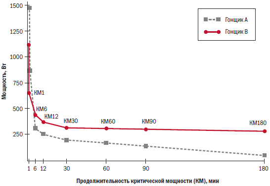 Обратите внимание на то, что профили двух велосипедистов на рис. 4.1значительно различаются между собой. Гонщик А способен производить значительно большую мощность в течение более коротких промежутков времени, чем гонщик B. Хотя гонщику B недостает мощности при непродолжительных тренировках, общая, более плоская форма его кривой свидетельствует о лучших способностях, связанных с выносливостью. На этапе финишного спринта гонщик A будет иметь определенное преимущество, однако гонщик B начинает выигрывать у него по мере увеличения продолжительности гонки.