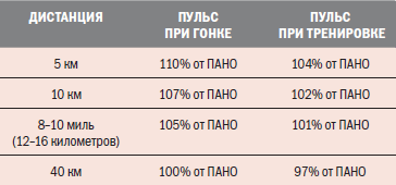 Достаточно простой способ оценки пульса ПАНО состоит в проведении индивидуальной гонки на время с одновременной фиксацией данных монитора (разумеется, я говорю о простоте самого метода, а не о простоте гонок). Вы можете выбрать для гонки расстояние 5 или 10 километров, 8 или 10 миль или 40 километров. Тест проводится в форме обычной индивидуальной гонки или тренировки. Средний показатель ЧСС в ходе теста будет служить своего рода предсказателем вашего ПАНО. Так как в ходе реальной гонки уровень вашей мотивации будет неминуемо отличаться от уровня мотивации в ходе тренировки, то результаты тестирования можно трактовать по-разному. В табл. 4.4показана основная формула расчета пульса ПАНО на основании данных индивидуальной гонки на время.
