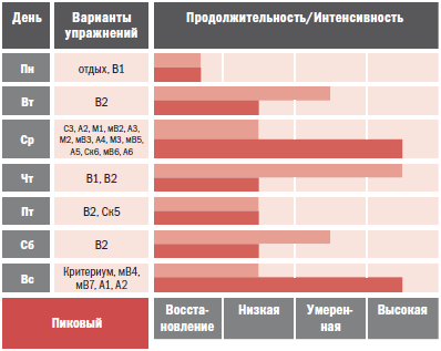 Cделайте отметку X в колонках «Выносливость» и «Мышечная выносливость». Отметьте главный ограничитель для каждой недели Пикового периода. Если вы не уверены в том, какой ограничитель выбрать, то выберите «Анаэробную выносливость».