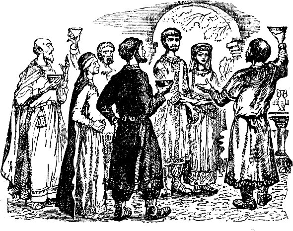 Он появился перед гостями в своей парадной одежде, какую надевал, отправляясь в царский дворец. За ним шел слуга. Он нес в руках драгоценный черный ларец, украшенный золотом и слоновой костью. Увидев удивленный взгляд Хайрана. Петехонсис поспешил объяснить, что в ларце сегодня нет целебных трав и настоек, в ларце подарки новобрачным. Взоры гостей обратились к волшебному ларцу. Все ждали, что извлечет оттуда Петехонсис. А египетский лекарь не торопился. Он посмотрел на счастливое лицо Яхмоса, полюбовался на Сфрагис, которая в этот час была так нарядна и красива, что походила на принцессу из дворца кушанского царя; он взглянул на Хайрана, на седую Син-Нури, на именитых купцов, собравшихся по случаю торжества, и сказал: