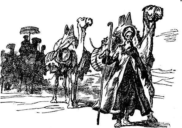 Впереди этого странного каравана они увидели высокого красивого старика с длинной белой бородой, в запыленном тюрбане, с громадным посохом в руках. Он был похож на погонщика верблюдов, который вел их караван. Он важно и неторопливо открывал шествие. За ним шли нескончаемой вереницей привязанные друг к другу верблюды. И чего только не было среди бедной поклажи этих кочевников! Свертки войлока, бронзовые котлы, глиняные кувшины, мешки конского и верблюжьего помета, заботливо собранного в дороге, чтобы потом использовать его для костров. Забавно болтались связки белых кур.