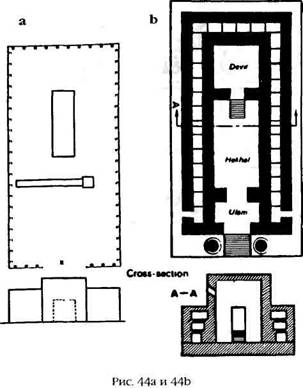 Такое деление храма на три основные части, воспроизведенное впоследствии и в других местах (например, храм Зевса в Олимпии, рис. 46а, или Ханаанский храм в Таинате в Верхней Сирии, рис. 46б), на самом деле являлось продолжением древней традиции, когда путь на вершину самых старых шумерских зиккуратов вел через два помещения – внешнее с двумя пилонами снаружи и зал для молитв. Эта структура приводится в работах Г. Мартини (рис. 47).