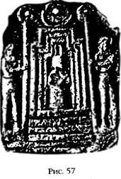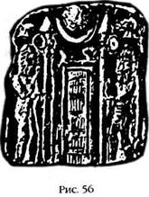 Найденные рисунки изображают богов, стоящих у входя в храм и держащих в руках шесты, к которым прикреплены кольцеобразные предметы. На связь этой сцены с небесными явлениями указывают символы Солнца и Луны (рис. 56). В одном из случаев древний художник, возможно, иллюстрировал сцену, описанную в ритуальном тексте из Урука. Энлиль и Энки стоят по обе стороны ворот, через которые должен войти Ану. Боги держат шесты с прикрепленными устройствами для наблюдений (инструменты круглой формы с отверстием в центре) – в полном соответствии с текстом, в котором говорится о «солнечных дисках» во множественном числе. Над воротами помещены символы Солнца и Луны (рис. 57).