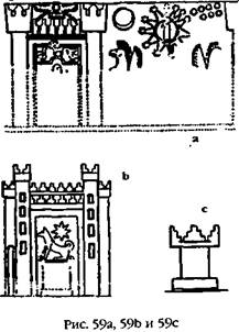 Согласно этому свидетельству две высокие башни храма были не просто архитектурными сооружениями, но служили для астрономических наблюдений. Вальтер Андреа, возглавлявший несколько наиболее успешных археологических экспедиций в Ассирии, высказывал мнение, что зубчатые венцы башен, стоявших по обе стороны ворот ассирийской столицы Ашшура, тоже служили этой цели («Die Jungeren Ishtar-Tempel»). Он нашел подтверждения своей гипотезе в рисунках ассирийских цилиндрических печатей, связывавших эти башни с небесными символами (рис. 59а и 59б). Андреа предположил, что некоторые из изображенных на рисунках алтарей (обычно вместе с исполняющим ритуалы жрецом) тоже имели отношение к астрономии. Их зубчатая верхняя часть (рис. 59с), а также расположение над воротами храма, на открытых площадках внутренних двориков, заменяли ступени зиккуратов – по мере того как сами зиккураты уступали место более простым в конструктивном отношении храмам с плоской крышей.