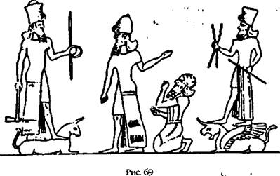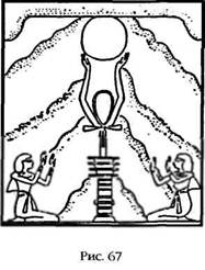 «Скажи, если знаешь. Кто положил меру ей, если знаешь? Или кто протягивал по ней вервь?» – спрашивал Господь Иова, предлагая признать, что хранителем тайн неба и земли является не человек, а Бог. В сцене представления царя-жреца богу Шамашу (рис. 54) смысл события передают фигуры двух Божественных держателей шнура. Два шнура, которые они протянули под углом к излучающей свет планете, предполагают не столько измерение расстояния, сколько ориентацию. На египетском рисунке с подобными мотивами, обнаруженном в папирусе царицы Нехмет, изображены два «держателя шнура», измеряющие угол планеты, названной «красным глазом Гора» (рис. 70).