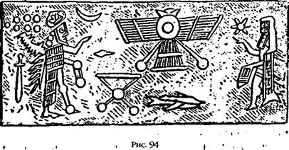 Поскольку Зодиак и сопутствующее ему небесное время были изобретены ануннаками вскоре после их первого появления на Земле, некоторые зодиакальные даты, относящиеся к событиям, изображенным на цилиндрических печатях, относятся к зодиакальным эрам, когда человеческой цивилизации еще не существовало. Эра Рыб, к примеру, на которую указывают две рыбы на рис. 94, приходилась на период между 25 980 и 23 820 годами до нашей эры (или раньше, если имеется в виду одна из предыдущих Эр Рыб в Великом Цикле из 25 920 лет).