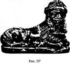Одними из наиболее впечатляющих находок, в настоящее время украшающими ассирийские и вавилонские отделы во всех крупнейших музеях мира, можно считать колоссальные каменные изваяния животных с туловищем быка или льва и головами богов в рогатых головных уборах (рис. 96), которые охраняли входы в храмы. Можно смело предположить, что эти «мифические существа», как называют их ученые, представляют собой воплощенный в камне мотив борьбы Тельца и Льва, о котором мы упоминали выше, и связывают храмы с магией древнего небесного времени и богами, ассоциировавшимися с прошедшими зодиакальными эрами. Археологи убеждены, что эти скульптуры были выполнены по образцу египетских сфинксов, главным образом Великого Сфинкса в Гизе, о котором ассирийцы и вавилоняне прекрасно знали – этому способствовали торговые связи и войны. Однако записи Гудеа показывают, что за полтора тысячелетия до того, как эти зодиакальные и одновременно божественные существа заняли место в ассирийских храмах, Гудеа уже поставил сфинксов в храме Энинну: мы читаем о «льве, внушающем ужас», и о «диком быке, припавшем к земле, словно лев». К удивлению археологов, полагавших, что сфинксы были неизвестны в Древнем Шумере, среди руин Гирсу в Лагаше была обнаружена статуя Нинурты/Нингирсу в виде припавшего к земле сфинкса (рис. 97).
