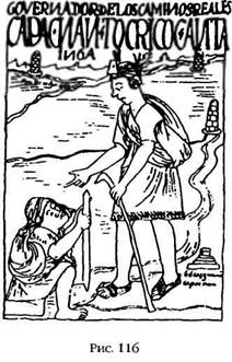 Когда в 1533 году испанские завоеватели дошли до столицы инков Куско, они с удивлением обнаружили крупный город, в котором около 100 тысяч жилых домов окружали религиозный и государственный центр, состоявший из величественных дворцов, храмов, площадей, парков, рынков и плацев. Они были изумлены, услышав, что город разделен на двенадцать районов, границы которых проходили по линиям между сторожевыми башнями, построенными на окружавших город горных вершинах (рис. 116). Конкистадоры с восхищением взирали на главный храм города и всей империи – не из-за его совершенной архитектуры, а из-за того, что он был буквально одет в золото. Оправдывая свое название, Кориканча, что означает «золотая ограда», храм был облицован золотыми пластинами; внутри хранилась удивительная утварь, а также фигуры птиц и зверей, сделанные из золота, серебра и драгоценных камней. Во дворе храма был устроен сад, все растения в котором были искусственными, изготовленными из золота и серебра. Только первый разведывательный отряд испанцев снял со стен и увез с собой семьсот золотых пластин (не говоря уже о множестве других ценных предметов).