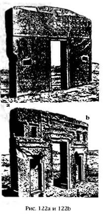 Это сооружение носит название «Ворота Солнца»; размеры гигантского каменного блока, из которого они были высечены, составляли десять на двадцать футов, а весил он более ста тонн. В нижней части ворот имеются ниши и геометрически правильные вырезы – особенно много их на той части, которая считается тыльной (рис. 122б). Наиболее искусная и загадочная резьба располагается на верхней фронтальной стороне (рис. 122а), обращенной на восток. Там в арке ворот вырезано рельефное изображение, состоящее из центральной фигуры – по всей видимости, это Виракоча, – по обе стороны от которой располагаются три ряда его крылатых спутников (рис. 123а). Центральная фигура и три ряда изображений располагаются над извилистой геометрической рамкой, которая как бы огибает миниатюрные фигурки Виракочи, проходя над ними и под ними (рис. 123б).