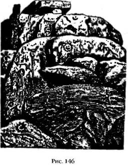 Владениями Кетцалькоатля/Тота была Центральная Америка, земли, населенные племенами нахуатль и майя, однако его влияние простиралось и южнее, на северные районы южноамериканского континента. Среди петроглифов, найденных неподалеку от Кайамарки на севере Перу (рис. 146), помимо Солнца, Луны, пятиконечных звезд и других небесных символов, часто встречается изображение змеи. Это эмблема Энки и его клана, а также божества, известного как «Пернатый Змей». Среди петроглифов также встречаются изображения приборов для астрономических наблюдений, один из которых находится в руках человека (жреца?), как на древних ближневосточных рисунках, а другой имеет изогнутые рога, как египетские устройства в храмах Мина (см. рис. 61).