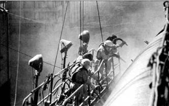 Четверо моряков пескоструями чистят корпус атомохода. Работы производятся только в спецодежде после проведения обязательного инструктажа по технике безопасности.