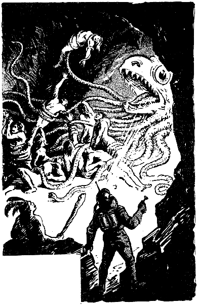 Двигатели Икара, Ии и Нора были гораздо мощнее «двигателя» страшной рептилии. Через несколько минут они уже кружили вокруг ящера, выбирая удобную точку для нападения. Оружие друзей было слишком грозным, чтобы им можно было пользоваться неосторожно. Оно могло бы разрушить скафандр и убить Андрея Дмитриевича.