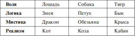 Воля (Лошадь, Собака, Тигр). Воля — это не мелкая черта характера, это идеология, магистральная линия поведения. Перечисленные три знака — это собранная в кулак власть мира. Все остальные живут без реального плана, качаются на волнах жизни и неизбежно подчиняются чужой воле, и лишь эти трое остаются хозяевами своей и чужой судьбы. Только им троим не лень связывать воедино реальность и логические схемы, только они пытаются соединить одной траекторией прошлое и будущее, поставив в центр полученной оси настоящее.
