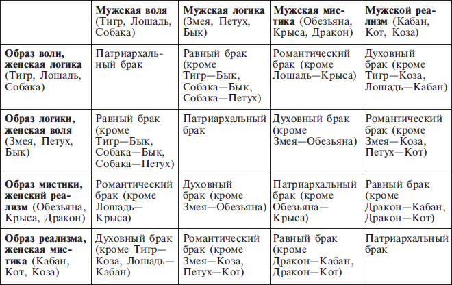 Тигр, Собака и Лошадь внешне демонстрируют ту же волю, что и мужские знаки, те же приметы власти в голосе, осанке, взгляде. Реально же они обладают логическим мышлением, точно таким же, как у мужчин логических знаков…