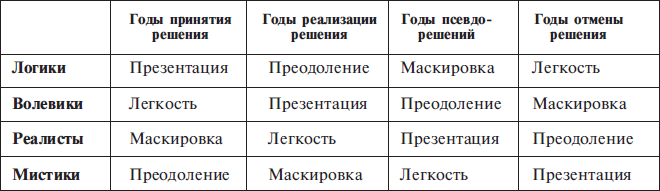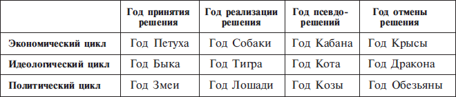Все человечество живет в четырехлетнем цикле. В годы Петуха, Змеи и Быка мы все синхронно принимаем решения. Побеждает тот, кто принял самое последнее (перекрывающее) решение. В годы Собаки, Тигра и Лошади принятые год назад решения необходимо осуществить. Затем в годы Кабана, Кота и Козы осуществленные решения приносят плоды, одновременно с этим, от безделья, принимаются ошибочные решения. Победу в такие годы одерживает тот, кто уступил право первого хода своему сопернику. Такие годы получили название годов псевдорешений. Завершает цикл год отмены решения, когда цикл возвращается вспять, готовясь к новому синхронному решению.