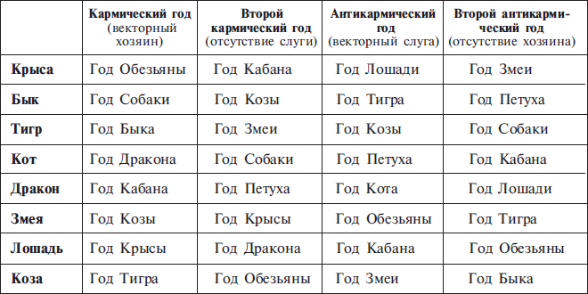 Кармический год — это год векторного хозяина. Именно такой год смешивает карты простой цикличности, как бы сбрасывает показание счетчика лет на ноль. Поэтому в нумерации 12-летнего цикла кармический год получает двенадцатый (или нулевой) номер, а следующий за ним год — первый. Так именно кармические годы становятся самыми революционными в жизни человека. Такие годы обрушивают все, что было построено до того, но и открывают новые горизонты.