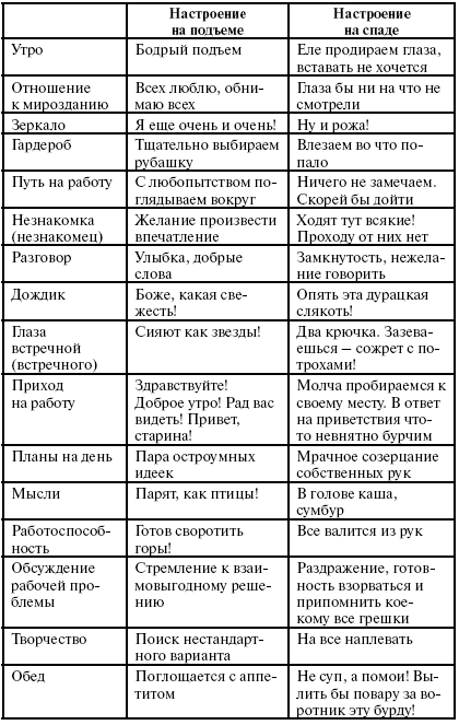 Итак, приступим к коррекции настроения. Собственно говоря, ничего сложного в этой работе нет. Просто в период спадов вам надо особенно тщательно следить за собой и не выходить из образа спокойного, сильного, уверенного в себе человека. Весь ваш облик должен говорить о том, что у вас все идет хорошо.