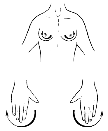 4) делать прямой (контактный) массаж молочных желез (лежа или принимая душ, растирать грубой рукавичкой груди в направлениях, показанных на рис. 15). Нередко женщины спрашивают, можно ли делать это при мастопатии? Да, можно.