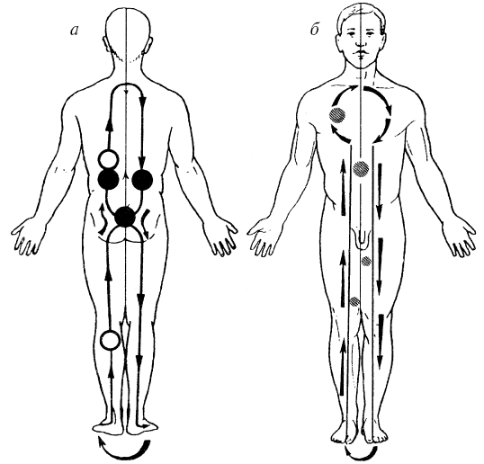Затем поднимаемся выше, движемся поверхностно вдоль позвоночника и сбоку от него (см. рис. 25а), делаем остановку в области почек, усиливаем ощущения до максимума, одновременно уходя вглубь.