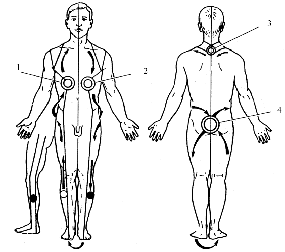 То есть в (1) делается небольшая остановка (с максимальным усилением ощущения), затем переход, как показано на рис. 27, на спину – в (3) («Дом отца», остановка), далее переход через плечо на переднюю поверхность тела в (2) («Дом трусливого обжоры», остановка и усиление ощущения до максимума).