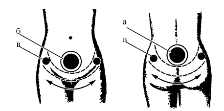 В поясничной области (а) концентрируем ощущение, доводим его до разумного максимума и удерживаем 8– 10 секунд, затем перемещаем его насквозь вперед – в область мочевого пузыря (б), где также удерживаем 8—10 секунд, сохраняя на том же уровне разумного максимума.