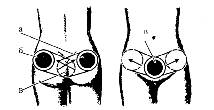 Затем чуть уходим вглубь и там, внутри, примерно посередине, начинаем перемещать это ощущение от бока к боку – по ходу тазобедренных суставов (складочек), как это показано на рис. 30. Делаем 15–20 движений в каждую сторону, после чего, не прерываясь, переходим у упражнению 1в.