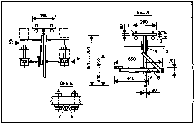 Рис. 4. Выталкивающий механизм: 1 — пластина; 2 — палец; 3 — металлический лист; 4 — втулка; 5 — рычаг; 6 — стойка; 7 — ось; 8 — скоба