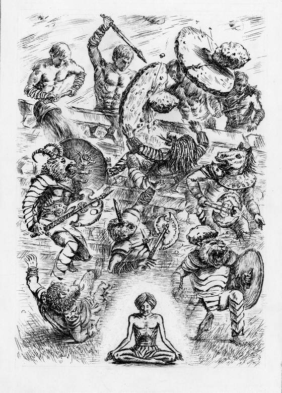 С рёвом и визгом карабкаются чудовища на огромные стены. Изнутри стены обороняют человекоподобные существа. Какого они роста? Десяти, двенадцати метров? Сами волосатые, тёмно-коричневые, в шкурах неведомых чудовищ. В руках – каменные щиты и копья с каменными наконечниками. Их возглавляет дивный прекрасный великан – чудное бледное лицо в обрамлении огненно-рыжих волос. Обороняющиеся бросают со стен огромные камни, сталкивают копьями вниз нападающих чудищ. Заливают их горящей смолой. Но и сами падают от камней нападающих фоморов. Иного зазевавшегося хватает огромными клыками за ногу или за руку высунувшаяся над стеной звериная голова и стаскивает вниз несчастного под торжествующие крики и рёв неистовой звериной толпы. Обороняющиеся сами кричат, ревут и визжат словно звери. Ах, что это было за зрелище! До путешественников доносится грохот битвы.
