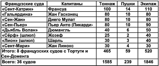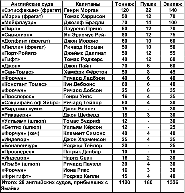 В «Правдивом отчете…» также говорится о 37 судах. Однако, по данным ямайского губернатора Модифорда, флот Моргана насчитывал 36 судов, в том числе 28 английских и 8 французских. Сохранился список всех капитанов и кораблей флота с указанием их водоизмещения, количества пушек и численности экипажей.