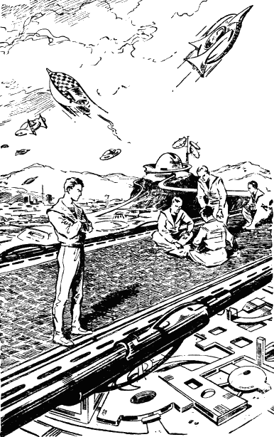 Кондратьев стал глядеть на проплывающие над вершинами сосен крыши домов. На одной из крыш блестело исполинское сооружение из нескольких громадных квадратных зеркал, нанизанных на тонкие ажурные конструкции. На всех крышах стояли птерокары — красные, зеленые, золотистые, серые. Сотни птерокаров и вертолетов висели над городом. Вдоль дороги, надолго закрыв солнце, проплыл с глухим свистящим рокотом треугольный воздушный корабль и скрылся за лесом. Никто не поднял головы. Далеко в туманной дымке обозначились очертания какого-то сооружения — не то мачты, не то телевизионной башни. Дорога текла плавно, без толчков, зеленые кусты и коричневые стволы сосен весело бежали назад, в просветах между ветвями появлялись и исчезали большие стеклянные здания, светлые коттеджи, открытые веранды под блестящими пестрыми навесами.