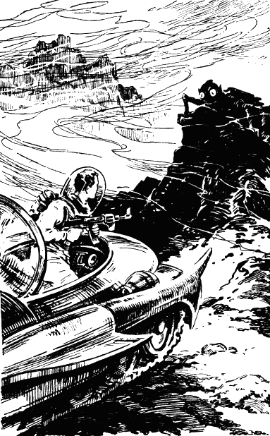 Над каменными осыпями висел туман. Поднималось маленькое красное солнце — красный карлик ЕН 92, — и туман казался красноватым. Под мягкими гусеницами вездехода шуршали камни, из тумана одна за другой выплывали темные невысокие скалы. Потом что-то зашевелилось на гребне одной из скал, и охотник остановил машину. На таком расстоянии рассмотреть животное было трудно. К тому же мешал туман и сумеречное освещение. Но у охотника был опытный глаз. Конечно, по гребню скалы пробиралось какое-то крупное позвоночное, и он обрадовался, что все-таки захватил с собой карабин. «Посрамим Крукса!» — весело подумал он. Он поднял крышку люка, осторожно высунул наружу ствол карабина и стал целиться. В тот момент, когда туман поредел и горбатый силуэт животного отчетливо обозначился на фоне красноватого неба, охотник выстрелил. Сейчас же слепящая лиловая вспышка возникла на том месте, где находилось животное. Что-то громко треснуло, и послышался длинный шипящий звук. Затем над гребнем скалы поднялись и смешались с туманом облака серого дыма.