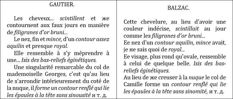 O Inca! о roi infortun'e et malheureux!Поэт, написавший много романов под разными псевдонимами и впоследствии отрекшийся от них, прежде чем усвоить себе вообще известный слог, выдержал жестокую и упорную борьбу, силясь овладеть французскою прозою. Юные романтики, последователи Гюго, долго не хотели признать в нем истинного художника, и это было тернием на его жизненном пути. Готье, обладавший тонким чутьем и признававший его талант, был единственный писатель, порадовавший его своим уважением. Но изумлению Бальзака не было границ, когда он видел, как молодой Готье, без всякой подготовки и затруднения, без малейших поправок писал статьи, прекрасные по форме и по содержанию, просто на конторке в типографии. Сначала он думал, что у Готье статьи уже готовы в уме, но потом убедился, что для искусного изложения мыслей требуется врожденный талант, которого у него нет. А как он трудился, чтобы приобресть эту способность! Как он указал Готье, когда вполне выработалась пластическая и художественная сторона его слога! Доказательства этому можно привести и из такого позднего времени, как 1839 г. В изображении главных женских типов своего романа «B'eatrix» Бальзак почти слово в слово заимствует целые выражения из статьи Готье, появившейся годами двумя раньше (об актрисах мадемуазель Жорж и Женни Колон). Сравните сами:
