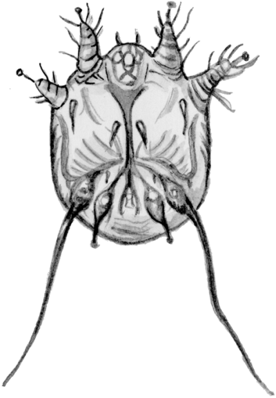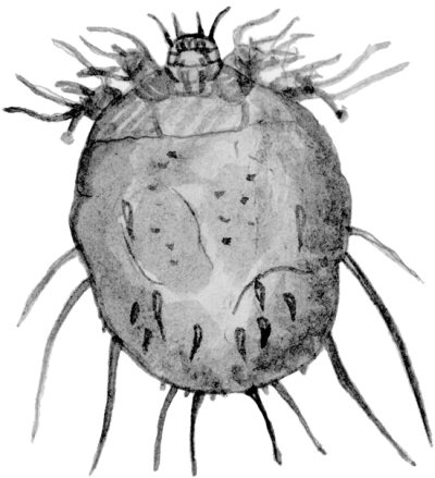 Зудневые клещи: 1 – род Sarcoptes; 2 – род Notoedres; а – самец, брюшная поверхность; б – самка, спинная поверхность
