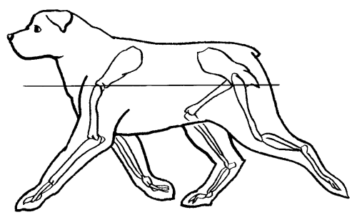 При осмотре собаки обращают внимание на развитие мускулатуры голени и бедра. Эти мышцы прилегают к бедренной, большой берцовой и малой берцовой костям, и очень важно, чтобы сочленение между костями имело правильный угол наклона. При движении собаки вперед, особенно быстром, мускулатура ее лап испытывает серьезную нагрузку и напряжение, поэтому ротвейлерам необходимы рельефные, крепкие мышцы, хорошо выраженные при осмотре и сбоку, и сзади.
