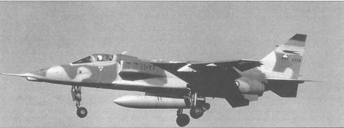 Эскадрилья 3/11 эксплуатировала «Ягуара» с 1975 г. Эскадрилья принимала участие в боевых действиях в Африке и па Среднем Востоке. На снимке – камуфлированная спарка «11-AF». На правой стороне киля нанесена эмблема эскадрильи ЕСЗ/11 – SPA69.