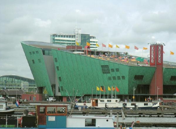 Тонет ли в гавани Остердок (Oosterdok) большой зеленый корабль или, наоборот, появляется из морских волн? Во всяком случае, издалека *NEMO (84), Столичный Центр науки и технологии, производит как раз одно из этих динамичных впечатлений. Построенный по смелому проекту итальянского архитектора Ренцо Пиано, центр был открыт в 1997 г. Здесь можно собственноручно поуправлять всевозможными техническими устройствами, что особенно привлекает детей. Девиз этого удивительного научного музея – интерактивность. Здесь есть лаборатория для экспериментов (например, можно сделать гигантские мыльные пузыри), а также «Путешествие в мозг». В «брюхе» NEMO исчезают все автомобили, въезжающие в туннель через залив Эй, а сверху, с *террассы на крыше, превращающейся летом в маленький райский уголок с шезлонгами и фонтаном, открывается потрясающий вид на исторический центр Амстердама.