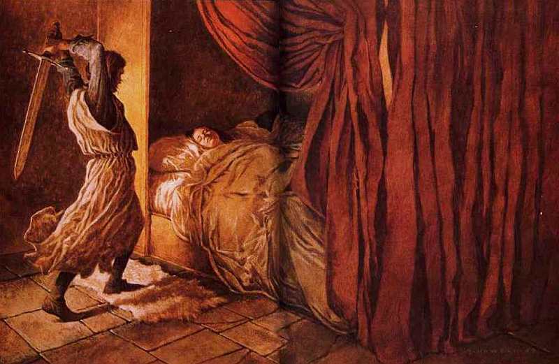 «А ты убьешь меня». — произнес старческий голос. Так и случилось. Мордред вытащил свой меч и одним жестоким ударом заставил старика замолчать. Мордред вытер свой клинок о его лохмотья, потом вложил меч в ножны и сказал: «Среди лжи ты сказал и правду. Старик, я убил тебя». Он посмотрел на Ланселота и встретил его угрюмый взгляд.