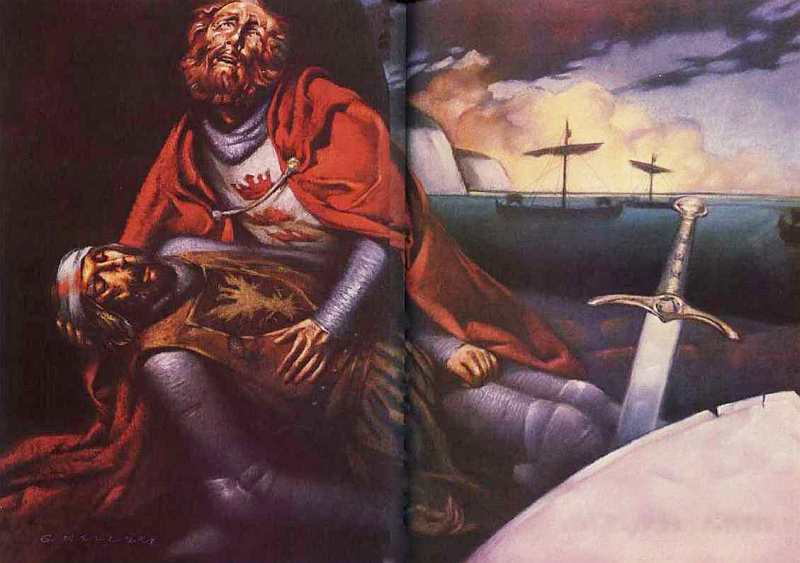 Ему это не удалось. На мелководье, на отмелях разгорелся бой. Его вел Верховный король. В своем боевом запале Артур был страшен. Его воины дрались бок о бок с ним, тесня воинов Мордреда, пока те не смешали ряды и не побежали, карабкаясь на утесы и оставляя своих мертвых товарищей на красном от крови песке.