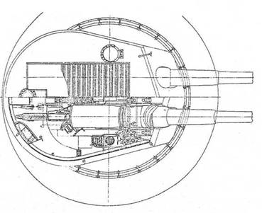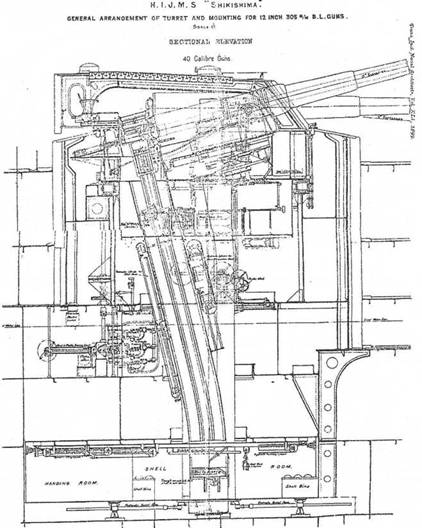 Вид сверху, план и продольный разрез барбетных установок, стоявших на броненосцах “Сикисима" и “Хацусе".