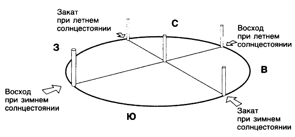 «На широте Стоунхенджа луч обзора восхождения солнца при летнем солнцестоянии совпадает по направлению с противоположной точкой захода солнца при зимнем солнцестоянии, и в обоих случаях… одна пара отвесно стоящих камней может быть использована для установки взаимообратного азимута».