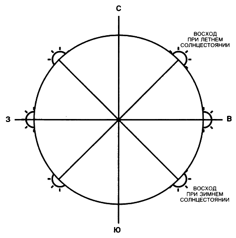 Это действо можно изобразить на простой диаграмме, отмечающей положение восхода и захода солнца в течение года на 51-м градусе северной широты.