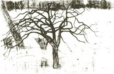 Совсем другим предстает Чюрлёнис в «Сонате звезд». Мысль художника обращена здесь лишь к космосу, к Вселенной – к звездам, к другим мирам. В обеих картинах господствует туман, заполняющий их беспокойными, извилистыми линиями. Вверху обе картины пересекает горизонтальная черная линия. Это звездный «путь- мост». Весь ритм Анданте возникает из более широких и определенных линий, чем в Аллегро, где каждая из линий прочеркнута в несколько рядов. В Анданте всюду используется только одна линия-контур, подчеркивающая границу тумана. Чюрлёнис, интересовавшийся литовским народным искусством, очевидно, знал про почитание древними литовцами ужа в качестве символа жизни, знал про их веру в то, что он охраняет дом и хозяйство. Уж изображен в Анданте. Глядя на Аллегро и Анданте «Сонаты звезд», нетрудно понять, что художник хотел средствами своего искусства изобразить возникновение мира из хаоса. Аллегро – это первичная стадия формирования космоса, где зародилось множество планет, но еще все тонет в бесформенном тумане. В Анданте все успокоилось, формирование мира завершилось.