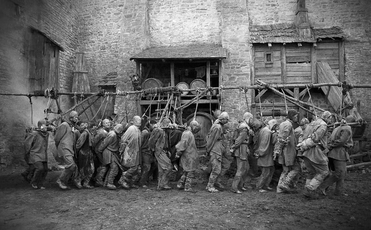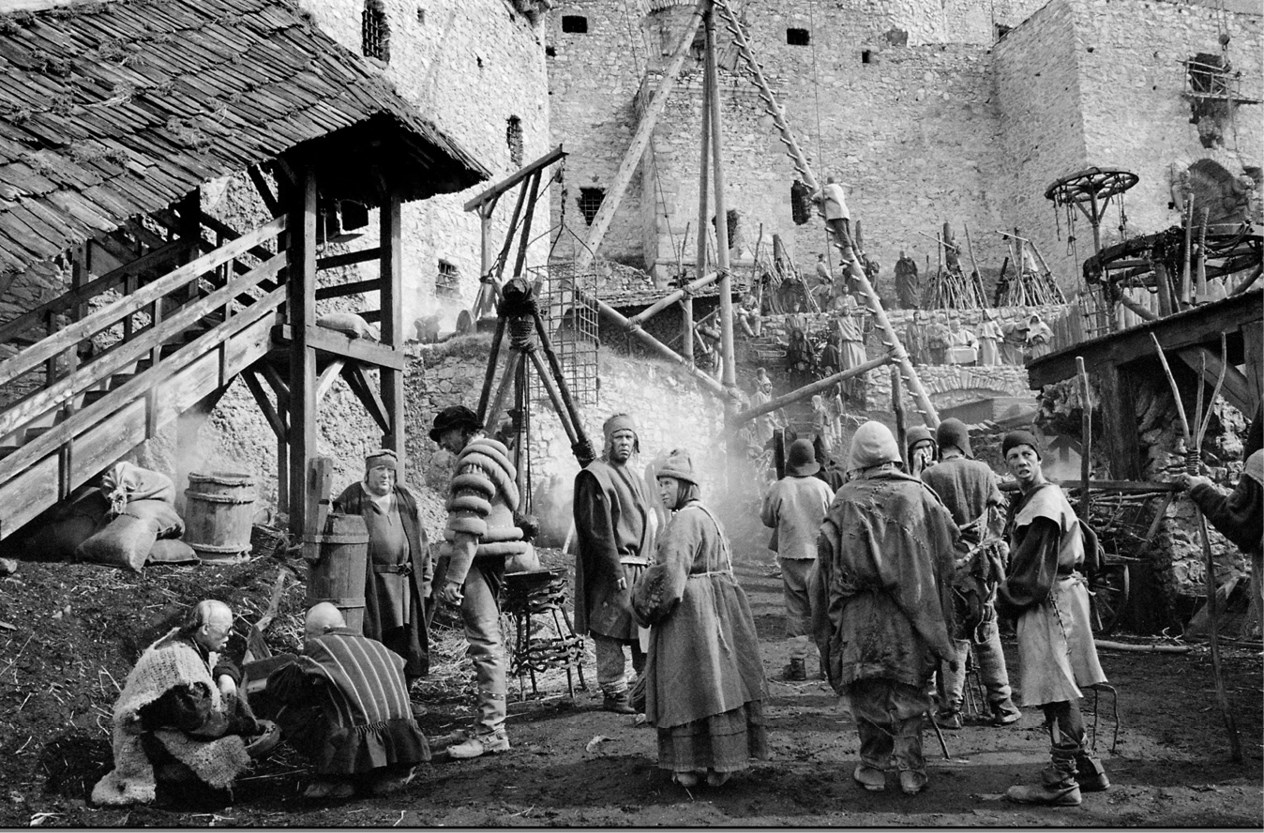 Коммуналка – мир «без чинов» и все же не способный избежать распределения амплуа. В соответствии с этим законом, подчиненный Лапшина Окошкин слушается его и в быту, когда приходит домой пьяным, а генеральша управляет семейной челядью – шофером и домработницей. Так и Румата помыкает своим верным однозубым оруженосцем Мугой, своеобразным Санчо Пансой этого неверующего Кихота, но любит его не меньше, чем свою гражданскую жену Ари – впрочем, готовую, в соответствии с кодексом Средневековья, исполнять роль безмолвной наложницы. Точно так же, безропотно и послушно, встроены в свои амплуа усталый здоровяк-король, дегенеративный принц с дебелой бритоголовой кормилицей, услужливые дворяне, одышливый царедворец Рэба, даже униженный придворный поэт Гур (на его роль режиссер взял Петра Меркурьева – родного внука Мейерхольда, даже игравшего роль своего деда в каком-то телесериале). Дворец, постоялый двор, дом Руматы, улицы Арканара и предместий – везде одна общая коммуналка, только распределение функций чуть-чуть отличается.