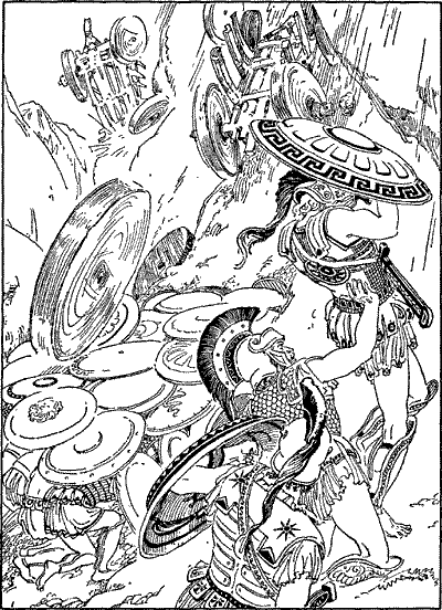 Но что же это? Фракийцы с ужасом увидели, что их повозки никому не причинили вреда. Они катятся вниз, в ущелье, кувыркаясь и распадаясь на части. Македоняне расступились и пропустили их. А где некуда было отступить, они вдруг, укрывшись щитами, превратились в большую черепаху, и повозки лишь прогрохотали по железу.